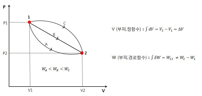점함수인 압력과 부피는 1점과 2점에서 일정하지만 과정함수인 일량은 과정에 따라 다르다