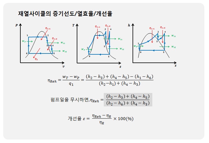 2)터빈을 통과시킨 증기를 다시한번 가열하여 열효율을 개선(건도가 증가)시킨 증기원동소 사이클